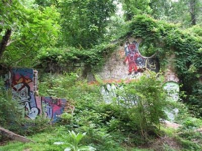 Visitors can explore the waterworks ruins through three connected trails starting at Mason Mill Park, including a concrete path with a bridge over railroad tracks.