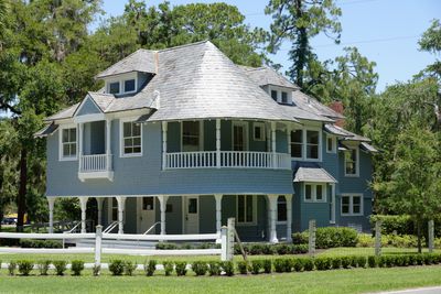 The Walter Rogers Furness Cottage features twelve rooms across two and a half stories, with a J-shaped covered porch and a Juliet balcony at 31.056667 latitude.