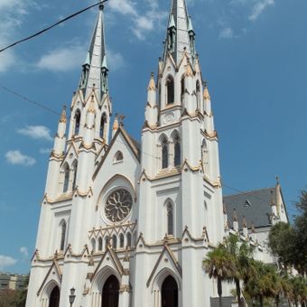 The Cathedral of St. John the Baptist is a Catholic episcopal church in downtown Savannah, Georgia, built from brick in the French Gothic manner. Sixteen stone gargoyles project from the outer walls, while inside, eighty-one colored glass windows filter daylight.