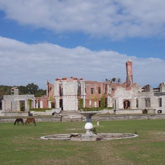 Dungeness is a historic plantation on Cumberland Island in Georgia with the remains of a brick and columned mansion. The grounds stretch along the island coast and are surrounded by old oaks and landscaped gardens.