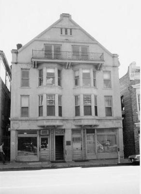 The four-story masonry building at 51 Broad Street features stuccoed brick walls and projecting bay windows on its second and third floors.