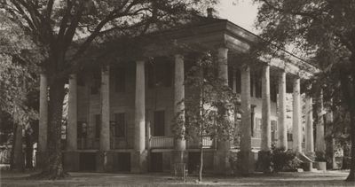 The house combines classical Greek Revival elements with regional building traditions, incorporating a low-pitched hipped roof and freestanding colonnade design.