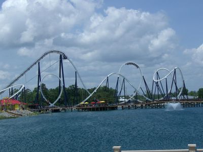 The Time Machine roller coaster stretches 3,738 feet in length and reaches heights of 150 feet with speeds up to 65 miles per hour.