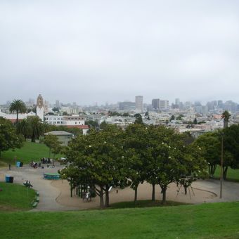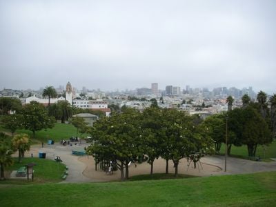 The park takes its name from the nearby 18th-century Mission San Francisco de Asís. On warm days, locals gather on the sloping lawns for picnics and sunbathing, and the open grass becomes a social meeting point.