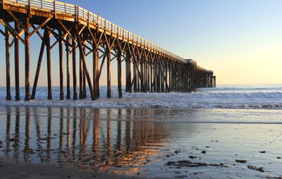 The protected cove features an 850-foot pier, white sand beach, and clear waters along California Highway 1 next to Hearst Castle Visitor Center.