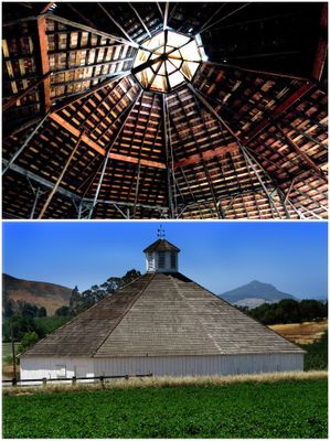 The barn represents early 20th-century agricultural innovation, combining Italian-Swiss and Azorean immigrant construction techniques in California's dairy industry.