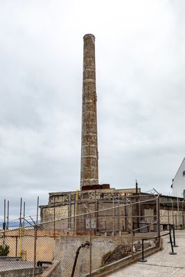 The Power House stands on the northwest coast of Alcatraz Island, featuring a white smokestack that extends into the San Francisco Bay skyline.