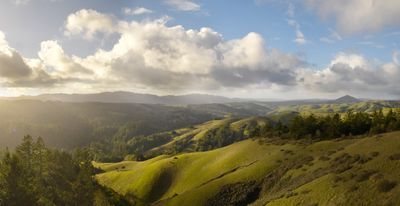 Samuel P. Taylor State Park spans 2,700 acres of redwood forest and grassland areas, featuring hiking trails through dense woodland and open meadows.