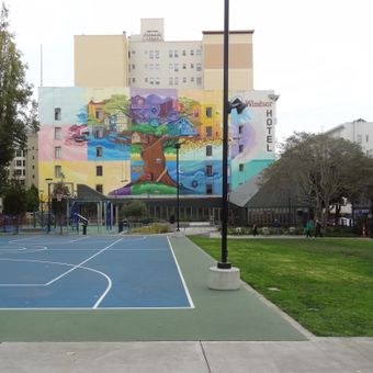 Boeddeker Park is an urban space covering approximately one acre in San Francisco's Tenderloin neighborhood. The park contains a basketball court, outdoor exercise equipment, a central grass area, a clubhouse with multipurpose rooms, and public restrooms.