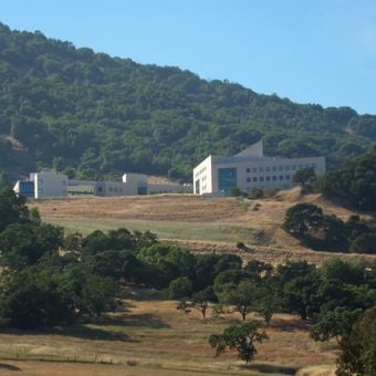 The Buck Institute for Research on Aging is a research institute in Novato, California that focuses on understanding aging and age-related diseases. The campus features multiple laboratory and office buildings designed by architect I. M. Pei, arranged around a central hexagonal courtyard with geometric shapes and floating stairs that create an open, modern feel.