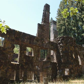 The Wolf House is a stone ruin near Glen Ellen, California, built from volcanic rock, redwood logs, concrete, and blue slate in the American Craftsman style. The remains show thick masonry walls with multiple rooms and architectural details that reveal the original scale and complexity of what was planned as a substantial private residence.
