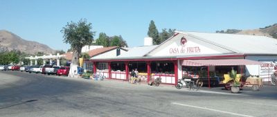 Casa de Fruta is a large shopping complex along a California state highway that combines a fruit and produce market, restaurant, wine sales, hotel, and recreational vehicle parking. The various facilities are arranged across a sprawling property and serve both travelers passing through and local shoppers.