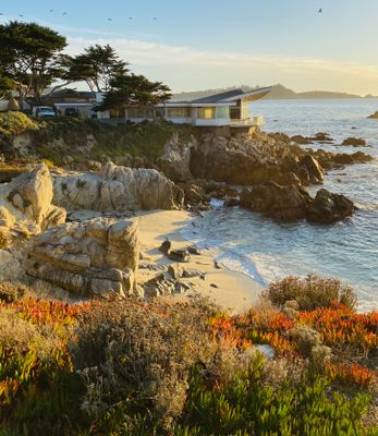 The Butterfly House features a distinctive wing-shaped roof design and sits directly on the rocky shoreline of Carmel Bay, offering views from Point Lobos to Pebble Beach.