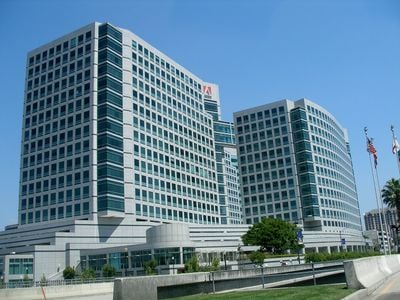 Adobe World Headquarters is a modern office complex in San Jose composed of three connected towers with glass and steel facades. The structure provides extensive workspace divided into areas for different business functions and team activities.