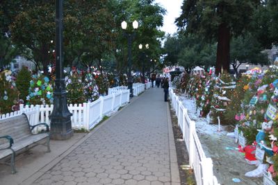 Local schools, businesses, and community groups contribute by decorating individual trees throughout the two-acre park, creating a collective holiday display.