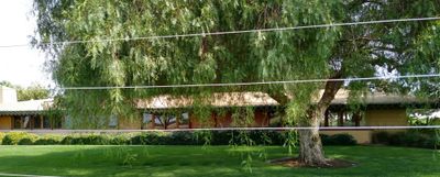 The Randall Fawcett House is a residential structure in Los Banos built with concrete block, mahogany details, and extensive glass panels. The home spans multiple living spaces on a substantial property that includes a swimming pool.