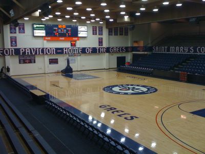 McKeon Pavilion is an indoor sports facility at Saint Mary's College in Moraga with bleacher seating along two sides of the court. The arena holds around 3,500 spectators and hosts basketball games, volleyball matches, and community events.
