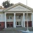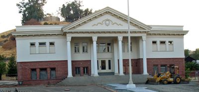 The Port Costa School building features Classical Revival architecture with symmetrical design elements and large windows spread across its two-story structure.