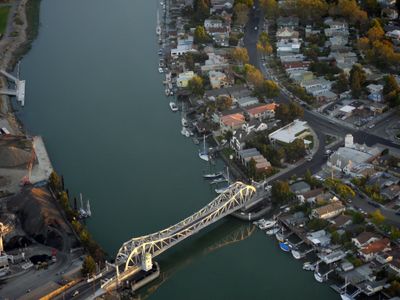 The High Street Bridge extends 296 feet across the Oakland Estuary, connecting the cities of Oakland and Alameda through a mechanical dual-leaf system.
