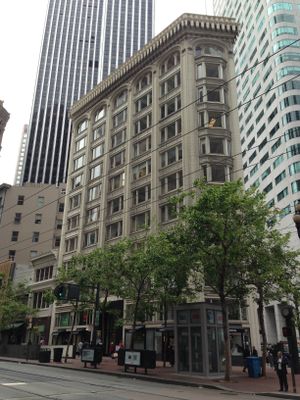 The Flatiron Building stands at 540 Market Street with a triangular shape formed by the intersection of Market and Sutter streets.
