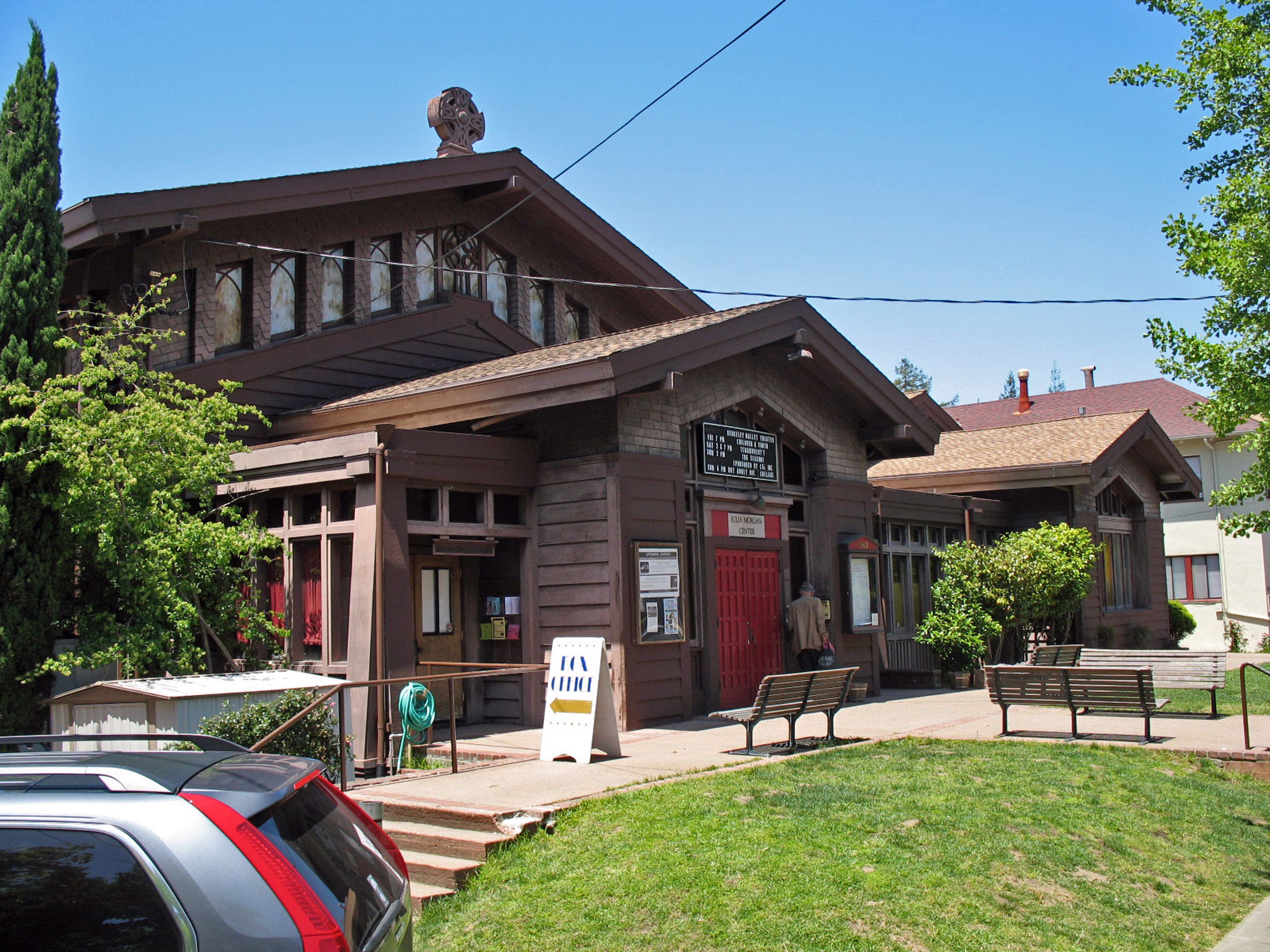 The church building at Lake Street and Arguello Boulevard features exposed wooden beams, natural materials, and large windows characteristic of early 1900s architecture.