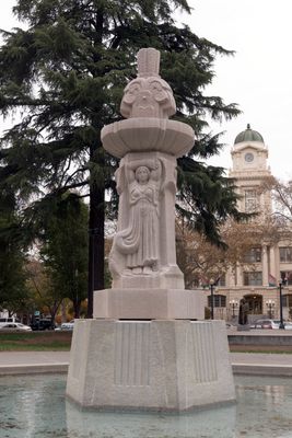 Cesar E. Chavez Plaza features cross-axial walkways, a central fountain, and provides views of Sacramento's historic civic buildings along J and I Streets.
