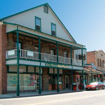 Sonora is a city in Tuolumne County in the Sierra Nevada foothills of California, spread across several hills with its historic core following Washington Street. The street is lined with mid-19th-century stone and wood buildings, many still showing their balconies and cast-iron facades.