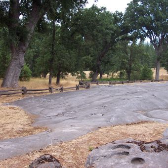 The Miwok people created 1,185 mortar holes in the marbleized limestone grinding rock, forming North America's largest collection of bedrock mortars.
