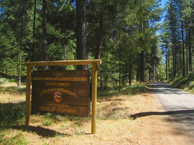 The forest encompasses 3,433 acres of mixed terrain with meadows, ridge tops, and dense forests containing pine, canyon live oak, and Western dogwood species.