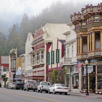 Ferndale is a village on the northern California coast in Humboldt County, where Victorian buildings line a main street. The homes display wooden porches, tall windows, and painted facades among green pastures in the Eel River Valley.