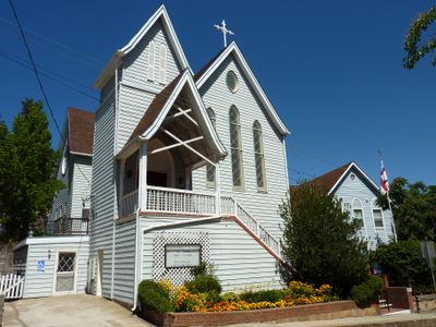 The Episcopal Church of Our Saviour at 2979 Coloma Street exhibits Gothic Revival architecture with wooden vaulted roofs and tall windows in thick walls.