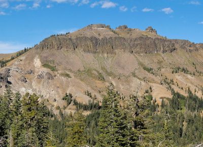 Castle Peak rises to 9,103 feet with three distinct turrets standing above the surrounding Sierra Nevada landscape near Interstate 80 and Donner Pass.