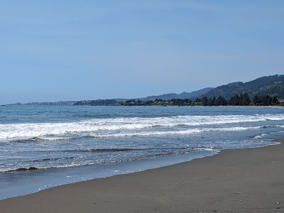 Located at the northernmost point of California's coastline, Pelican State Beach features a long sandy shore with scattered driftwood and Pacific Ocean views.