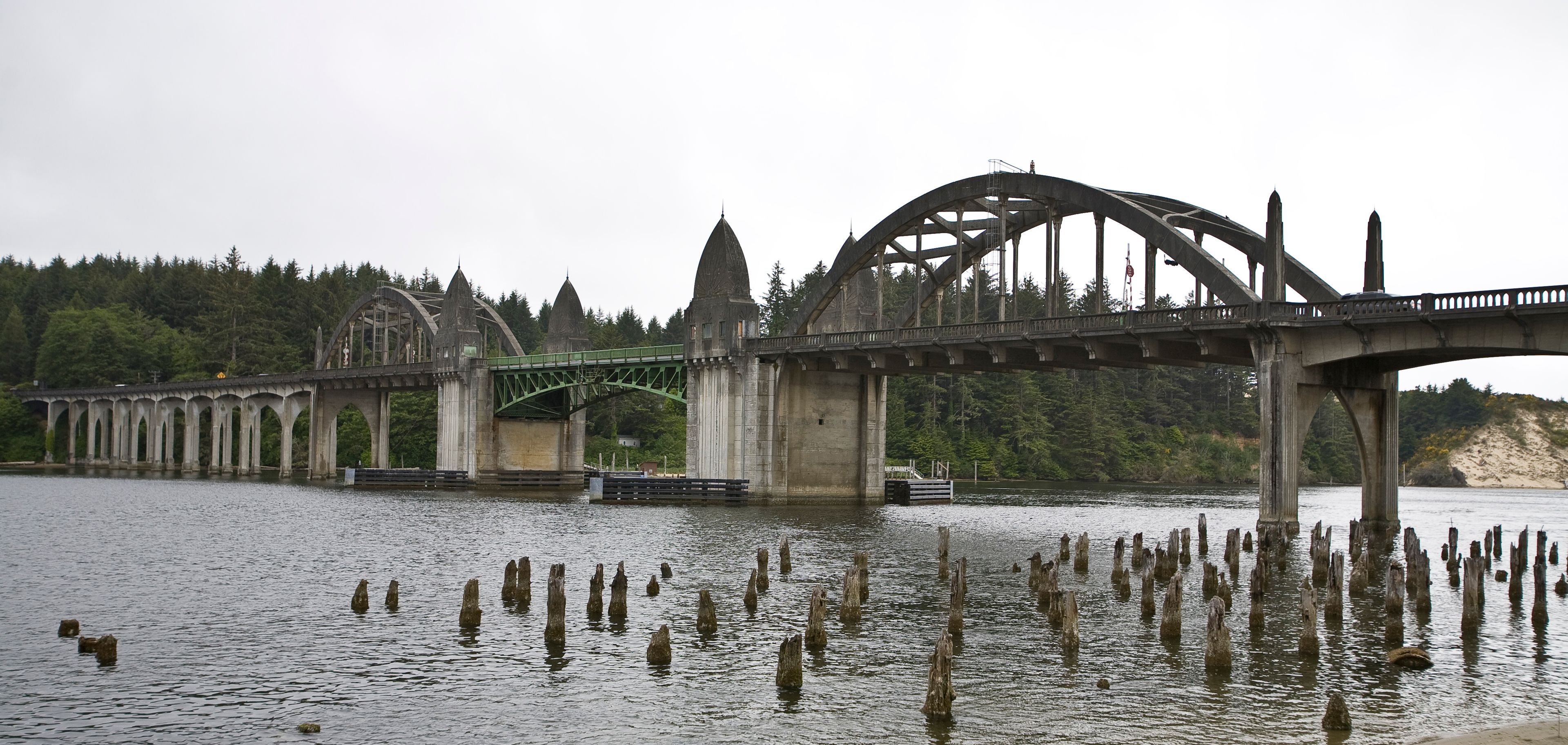 The Siuslaw River Bridge combines a tied-arch design with a bascule mechanism that lifts to allow maritime traffic to pass underneath the structure.