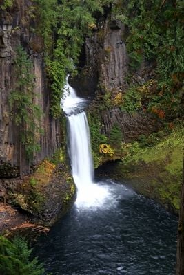 The North Umpqua River plunges 120 feet in two distinct steps through walls of columnar basalt formations into a deep pool.