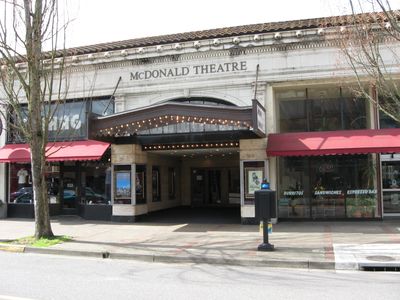 The McDonald Theatre stands at 1010 Willamette Street, featuring a preserved architectural design from the 1920s with detailed stone and brick facades.