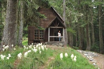 The wooden two-story cabin stands at 5,000 feet elevation between Fairview Peak and Grouse Mountain, surrounded by Douglas fir and spruce forest.