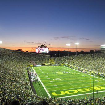 Autzen Stadium is a football stadium in Eugene, Oregon, built in a sunken bowl with 53,800 seats. The spectator stands curve gently around the playing field and bring every seat close to the grass surface.