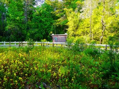 The natural site spans 18 acres and features a boardwalk trail leading to a fen where carnivorous Darlingtonia californica plants grow in clusters.