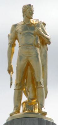 A thirteen-foot bronze figure stands at the highest point of the State Capitol Building, wearing frontier clothing and carrying a walking stick.