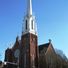 The Salem First Methodist Church building features a distinctive tall spire and Gothic Revival architecture with detailed brick construction patterns.