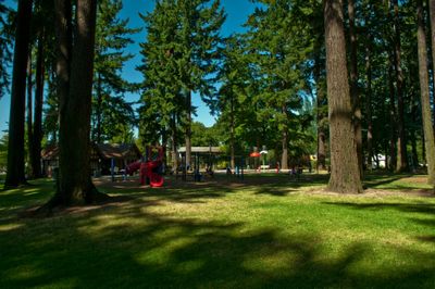 Columbia Park extends across 35 acres of land, containing Douglas firs, lindens, sports fields, walking trails, and multiple recreational areas for outdoor activities.