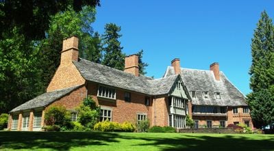 The M. Lloyd Frank Estate features Pennsylvania slate roofing, metal gates by Oscar Bach, and sits on 8.5 acres at Lewis & Clark College campus.