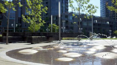 Elizabeth Caruthers Park encompasses 2.12 acres of land with a central fountain, plaza, splash pad, and bocce court in Portland's waterfront district.