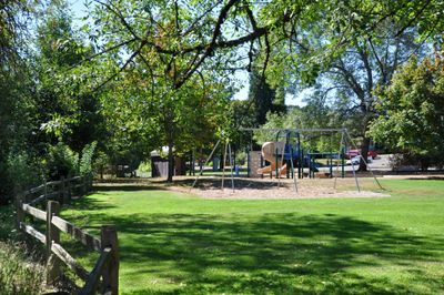 The park provides facilities including a playground, picnic tables, and paved paths, with operating hours from 5:00 AM until midnight.