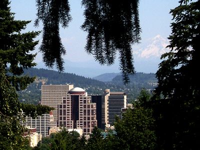 The 1000 Broadway building extends 24 floors into Portland's skyline, featuring a distinctive domed roof and multiple rings in its architectural design.
