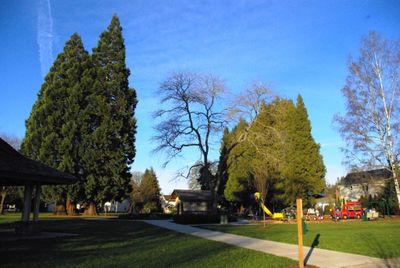 The two-acre Bagley Park features walking paths, sports fields, and playgrounds surrounded by mature redwood and cottonwood trees throughout the grounds.