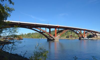 The Sellwood Bridge spans 1,976 feet across the Willamette River with three steel deck arches and two traffic lanes that expand to four at the west end.