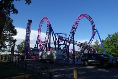 The Gerstlauer-manufactured Euro-Fighter coaster features a bright blue and pink color scheme with a vertical lift hill and three distinct inversions along its track.