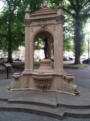 Located at 1000 SW Park Avenue behind Schnitzer Auditorium, the fountain includes separate drinking basins for humans and dogs at different platform levels.